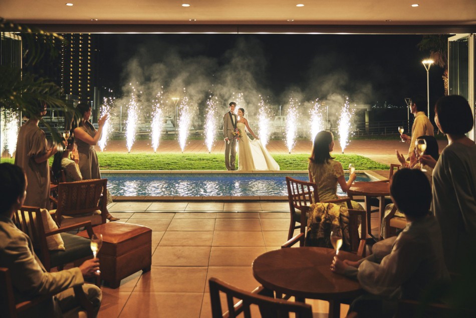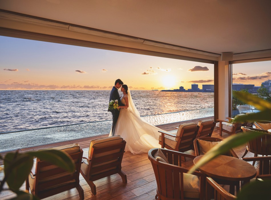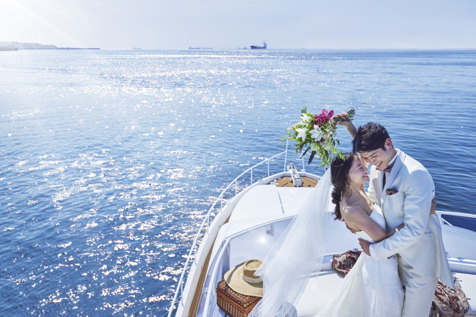千葉県千葉市にあるリゾート型ゲストハウスの広告撮影事例です。『出向する』という意味の名前を持つ東京湾を一望するウォーターフロントのロケーションでしか体験できない一日を、最大の特徴でもある海と空の青が広がる会場とともにクルーザでの入場シーンやガーデンでの花火など様々なカットに落とし込みました。ベールの風に靡くような柔らかな動きや水面の光の反射、動きのあるポージングでリラクシーな雰囲気や潮風が香るような臨場感を丁寧に描写し、シーサイドウエディングならではのビジュアルで表現しています。