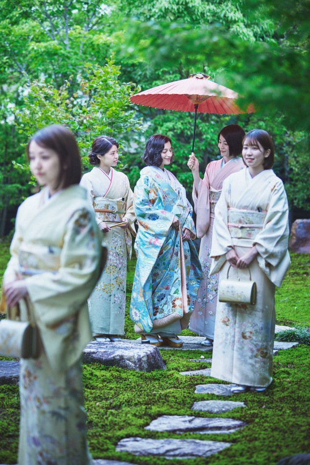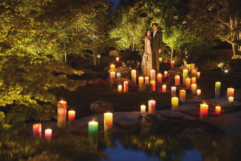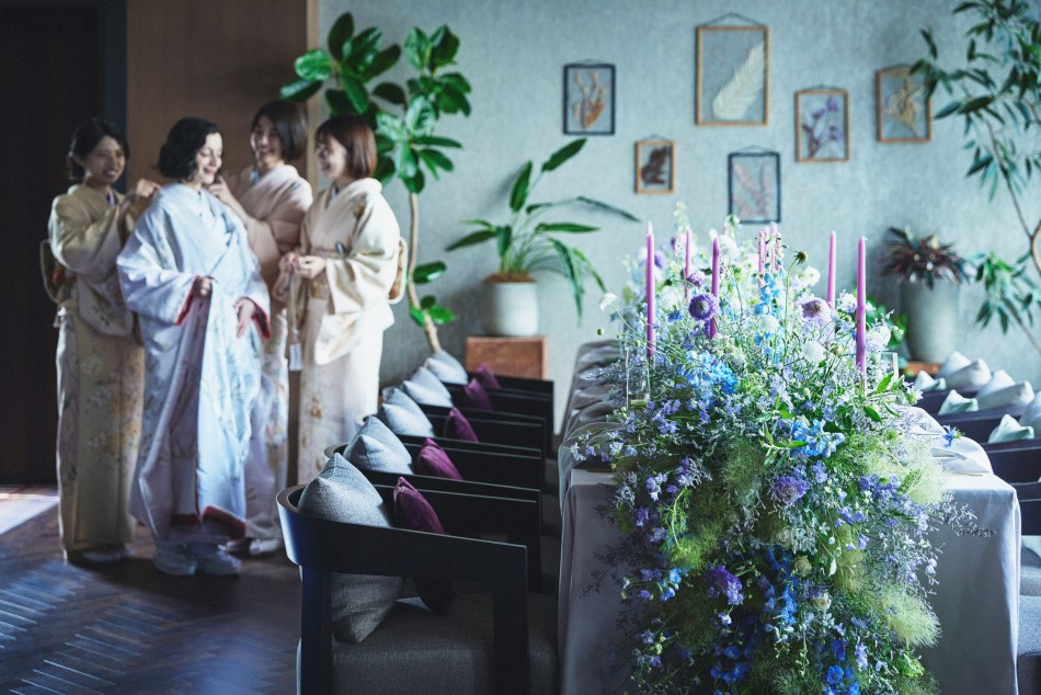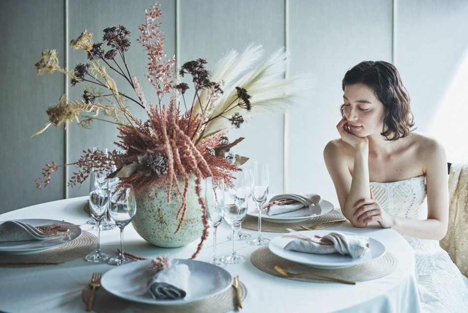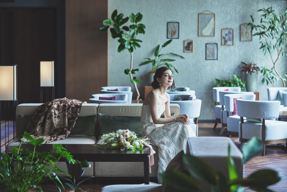 岐阜県岐阜市にあるゲストハウスの撮影事例です。大自然と伝統を近代建築に見事に表したウエディング会場で、フローティングをコンセプトに、柔らかく淡い色調でアンニュイさやフェミニンさを表現しました。うっすらと入れる陰影で情緒感も演出しています。ハード面は強みを一層反映させるために、意図的な構図を多用することで広告効果を最大化させています。低コントラストが効いたしっとりした描写は、ずっと見ていられるような上質な広告ビジュアルを生み出しています。