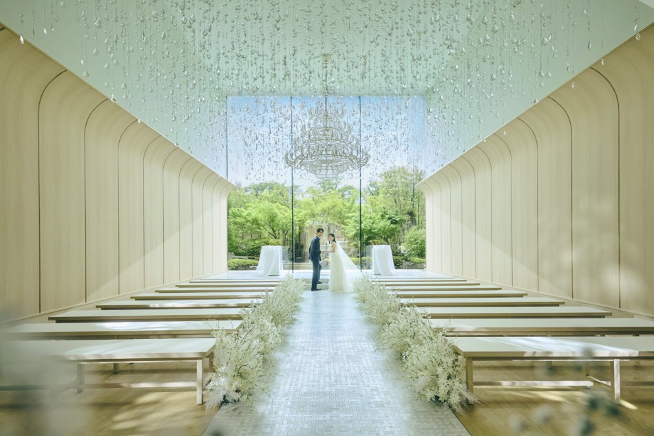 福島県郡山市にあるゲストハウスの広告撮影事例です。四季折々表情を変える豊麗な自然にとけ込み調和する結婚式のための邸宅。チャペルでは、正面から降りそそぐ太陽の光と、その光を受け眩しく瞬くクリスタルを活かし、披露宴会場では、円を描く上質な照明が特徴的なハード面を意識して撮影を行いました。ラウンジスペースでは、上質な空間描写だけではなく、おもてなし要素としての描写も意図的に組み込み、会場の魅力や期待感を一層高める広告ビジュアルを創り上げています。