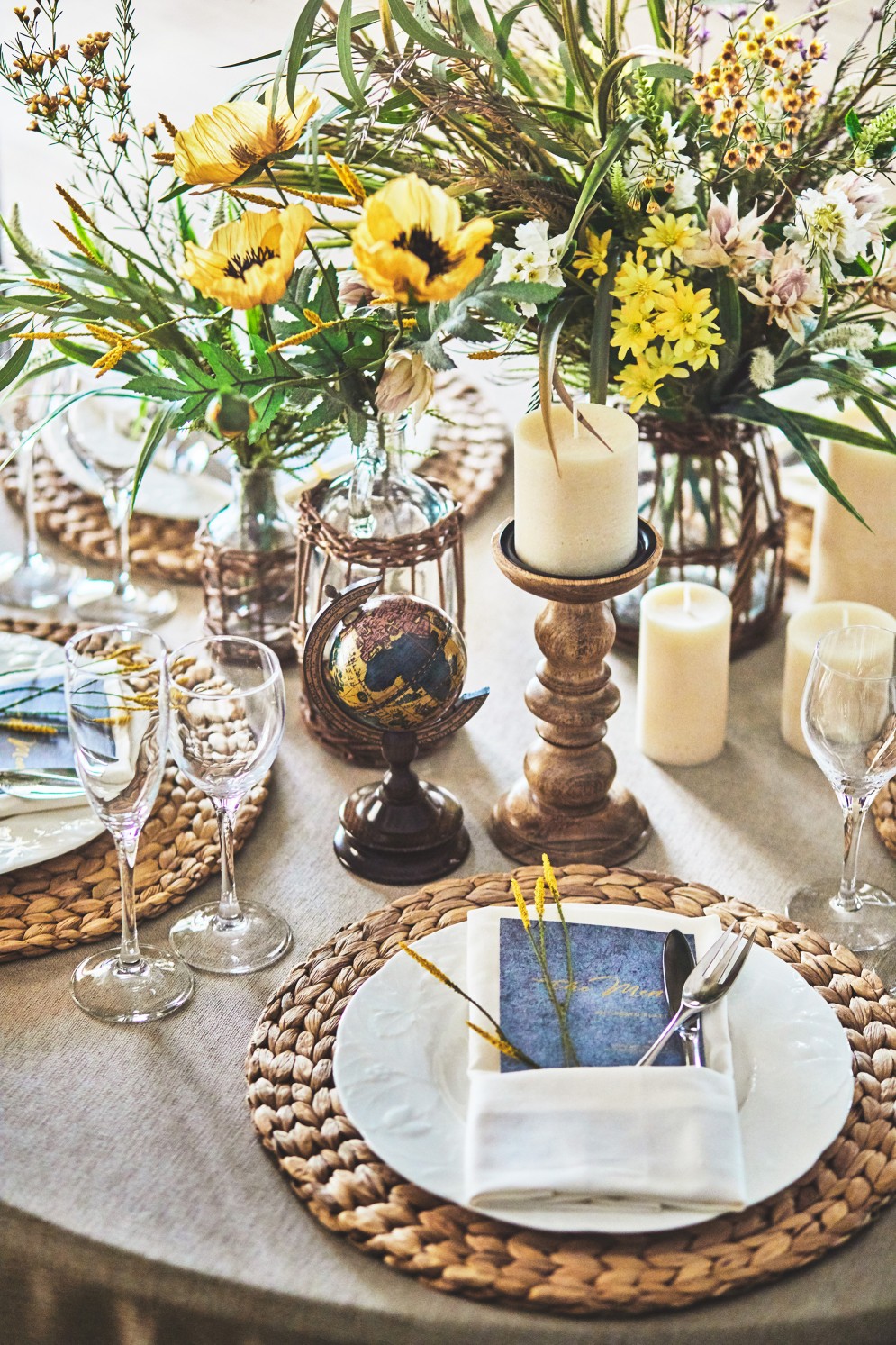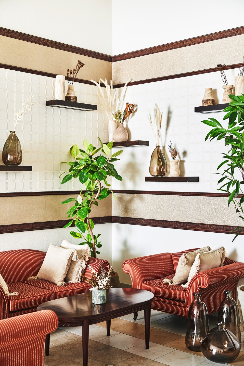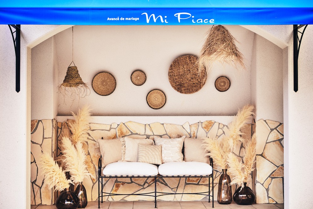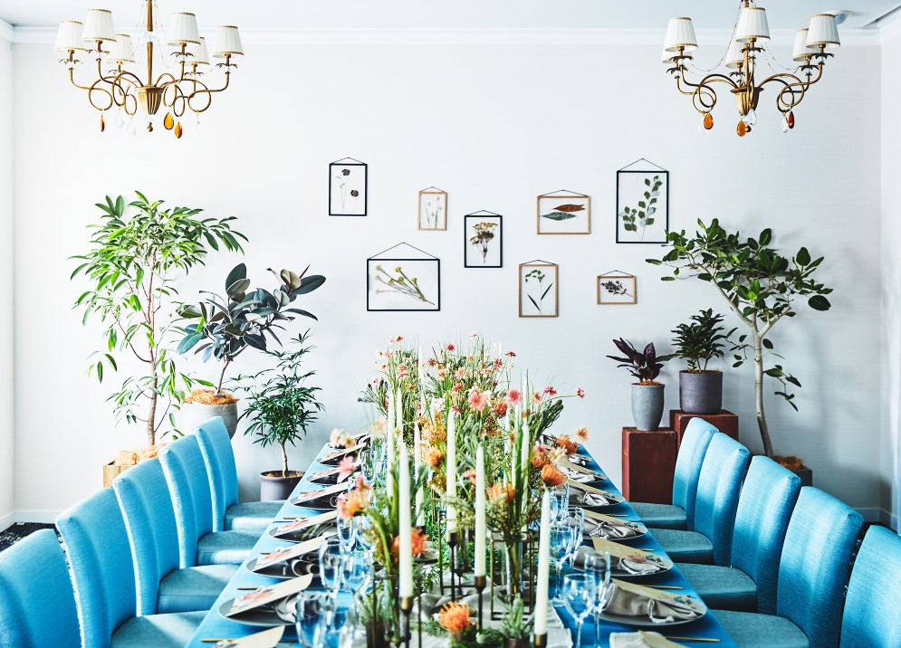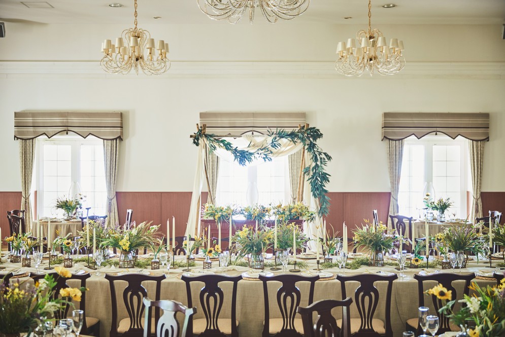 福島県にある欧風リゾートテイストのゲストハウスの館内装飾をプロデュースしました。現場のプランナーの趣向で揃えた館内装飾を一掃し、「地中海リゾート」というコンセプトをビジュアル表現して、施設のバリューアップを図るべく、海外のリゾートホテルのイメージをインプットして、植栽、アート、ファブリック類、バンケットやチャペルの造花や卓上小物に至るまで厳選し、制作、買い付け、設置までをトータルで行いました。